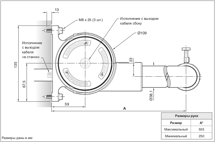 В системе используется контактный датчик RP3 с механическим срабатыванием. Возможна установка в держатели сторонних производителей. Резьба M4 позволяет использовать контактные щупы Renishaw. Подключение выполняется через OEM-комплект.